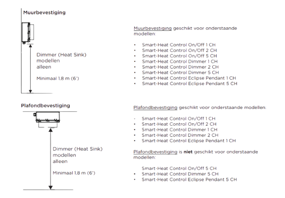 1-kanaal controllers zijn geschikt voor een maximum van 6 kW, terwijl 2-kanaals controllers geschikt zijn voor 12 kW. Beide opties kunnen meerdere verwarmers bedienen binnen hun maximale capaciteit. Elk kanaal kan tot 10 gasverwarmers aansturen.