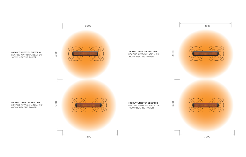 Buitenverwarming op maat was nog nooit zo eenvoudig. De vier modellen variëren van 2000W (2 kW) tot 6000W (6 kW) en er is de mogelijkheid om de individuele elementen van de 4 kW- en 6 kW-modellen afzonderlijk te regelen.